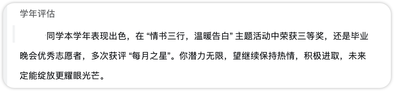 教师高效评语:基于学生成绩、荣誉等成长数据,AI智能生成学年评语初稿,大幅减轻教师撰写负担。