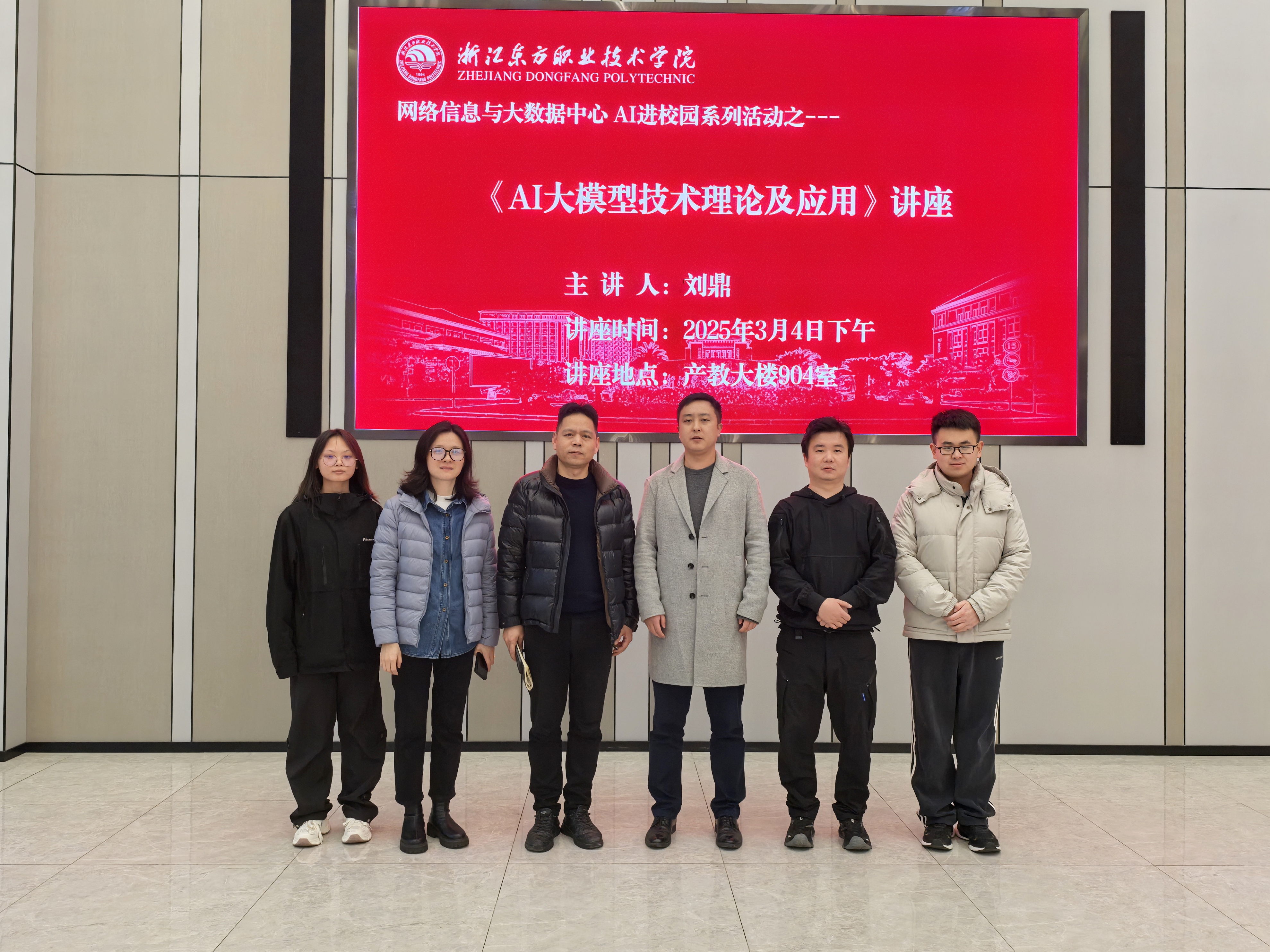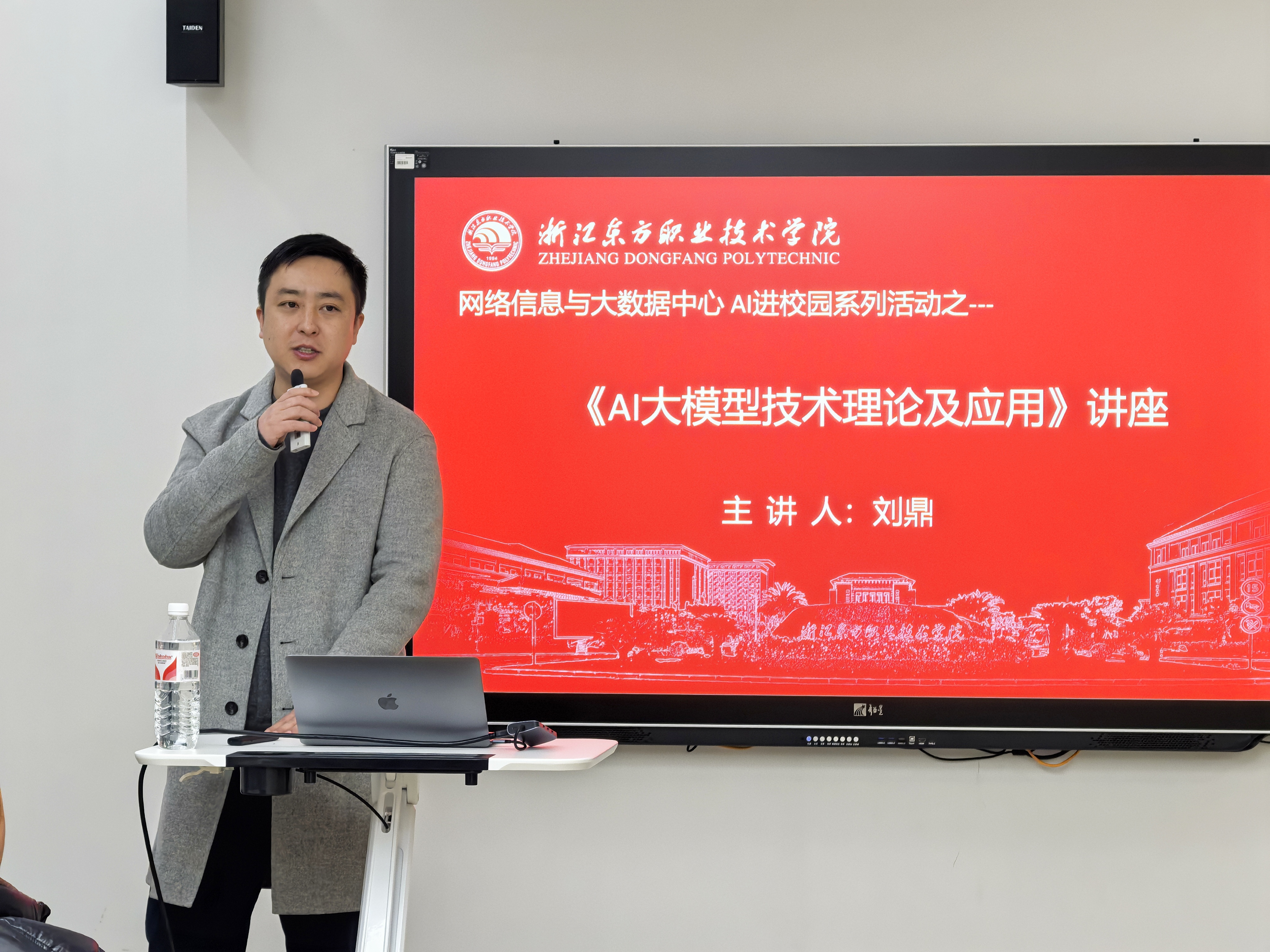 为拓宽我校学生视野,了解人工智能领域前沿动态,激发对人工智能领域的兴趣,3月4日,浙江东方职业技术学院特邀阿里云架构师刘鼎老师来校,在产教大楼904智慧教室作题为“AI大模型技术理论及应用”的专题讲座。本次讲座由网络信息与大数据中心主办,吸引了各二级学院学生到场聆听。